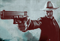 In a short commercial for Justified that aired during Super Bowl XLV, meanwhile, Raylan Givens has his own suspect at gunpoint. “This situation feels very familiar,” he begins. “In fact, I know what you’re thinking. ‘Did he fire seventeen shots or sixteen?’ Think I may have lost track myself. So I suppose there’s only one question you should be asking yourself.”